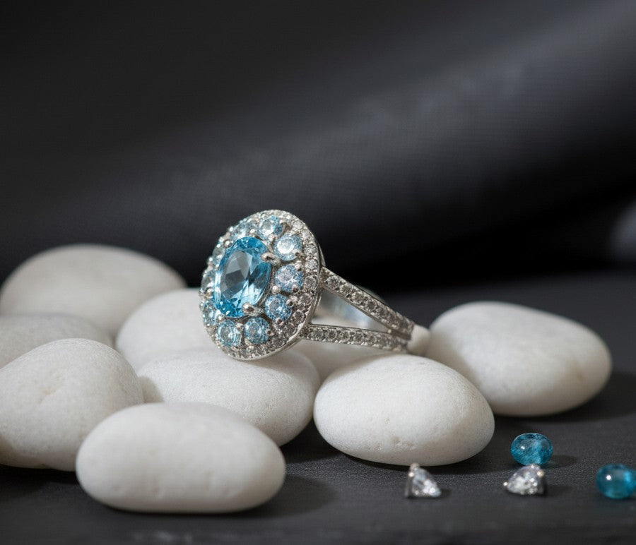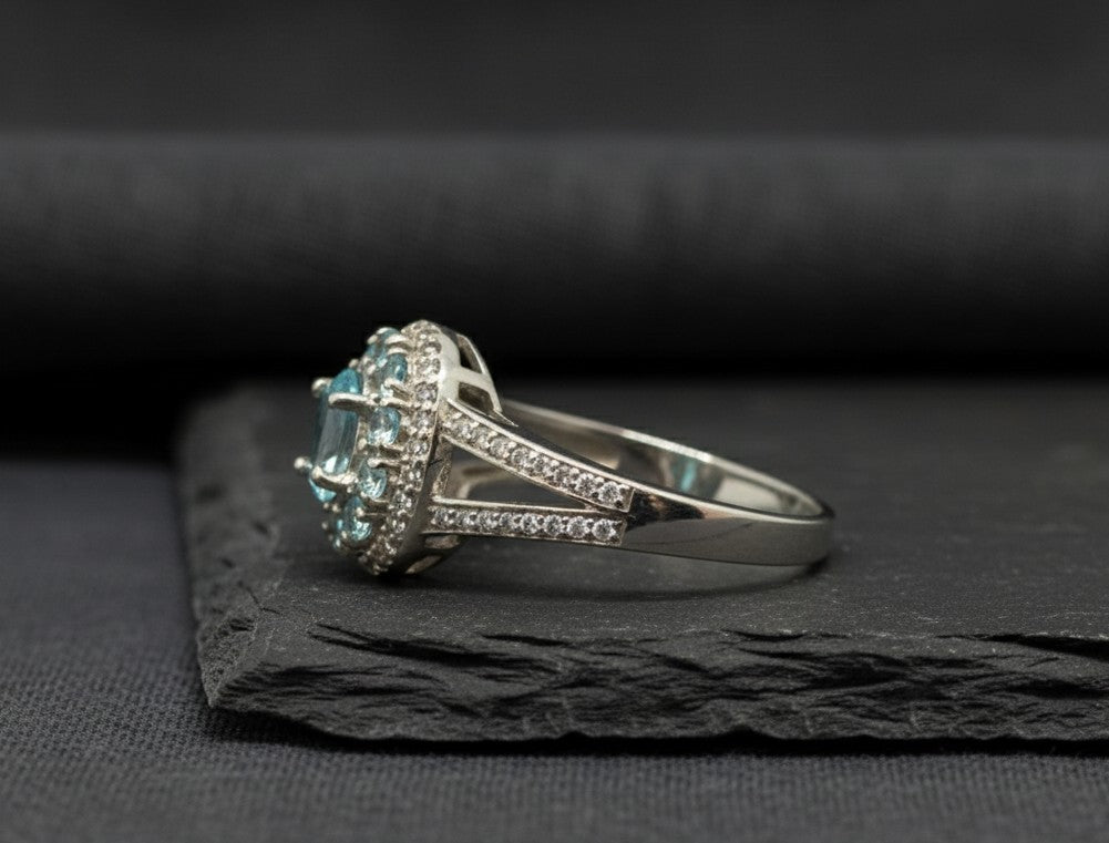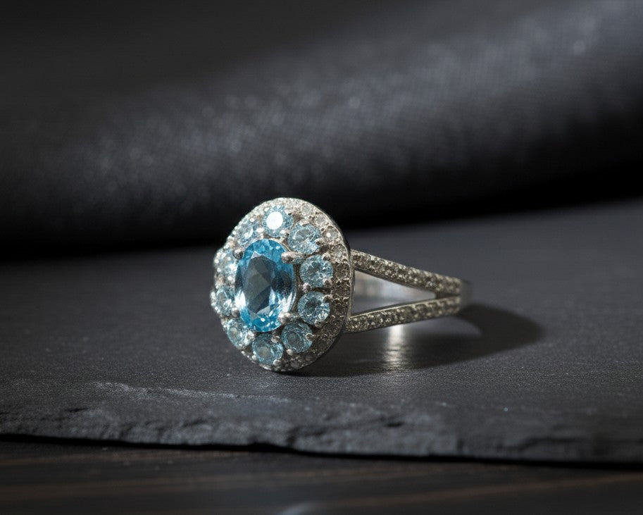 We focus on presenting high-quality, genuine gemstones set with intricate craftsmanship. This ring features a beautiful Natural Blue Topaz surrounded by coordinating stones, enhanced by the fiery brilliance of Moissanite accents on the split band. All set in reliable 925 sterling silver, this piece is designed to look rich and last beautifully.