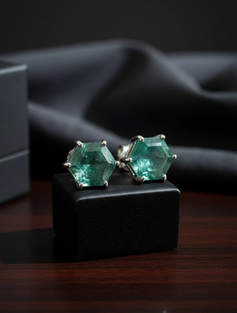 These unique studs bring the serene beauty of a hidden forest right to your ears! They feature perfectly matched, hexagonal cuts of Natural Moss Agate, showcasing gorgeous, deep green inclusions that look like tiny moss gardens trapped in stone. Set simply in Sterling Silver prongs, the focus remains entirely on the organic, earthy beauty of the gemstone. They’re the perfect subtle statement piece for anyone who loves nature-inspired jewelry with a clean, geometric edge.
