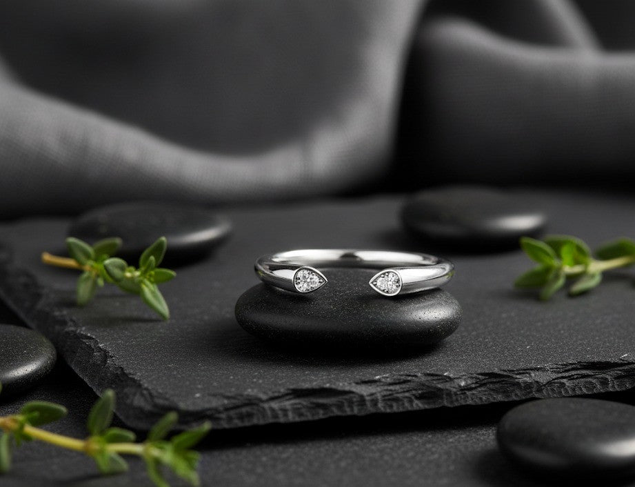 Embrace sleek, modern design with this elegant Open Bypass Ring. This piece features two brilliant Natural Moissanite gemstones, cut in a sophisticated pear shape, that face each other across an open space on the band. Set in cool Sterling Silver, the design feels light, contemporary, and effortlessly chic. It’s a wonderful choice for minimalist lovers or anyone looking for a unique, non-traditional ring that still shines brilliantly.