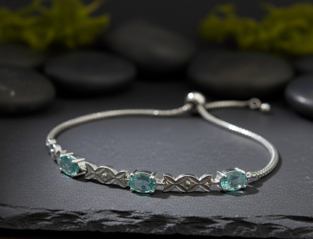 This delicate bracelet whispers of clear, tranquil waters and sunlit serenity. It features a repeating pattern of oval Natural Blue Topaz gemstones, each set securely within beautiful Sterling Silver links. The entire piece is adjustable thanks to a practical bolo slider mechanism, allowing you to achieve the perfect, custom fit effortlessly. It’s the ideal piece for someone who loves genuine color, lightweight comfort, and timeless, cool-toned elegance.