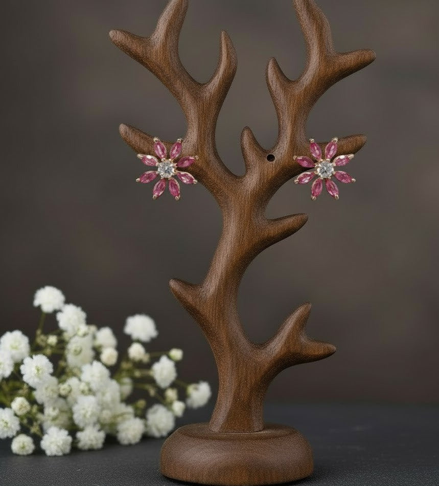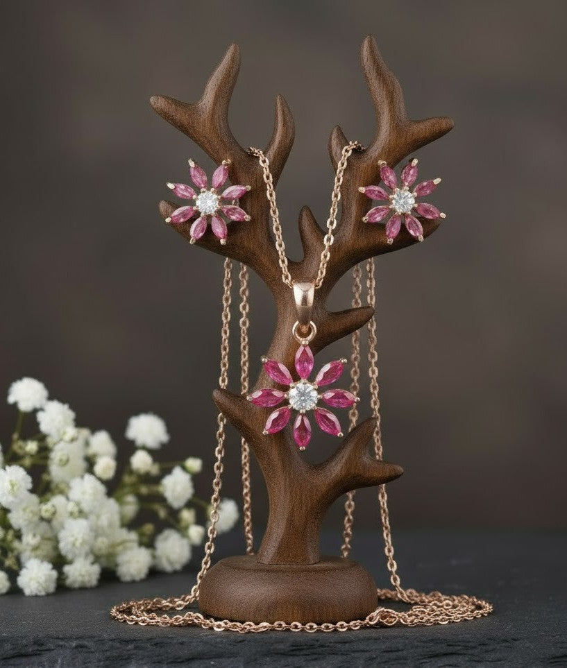 This jewelry set is a vibrant miniature garden brought to life with fiery color! The set includes matching stud earrings and a pendant necklace, all showcasing a beautiful flower motif. Each petal is crafted from a brilliant, teardrop-shaped Natural Ruby, centered around a sparkling Moissanite accent. Set in a warm, romantic Rose Gold Tone metal, this set offers deep passion and undeniable brilliance—perfect for making a refined statement.