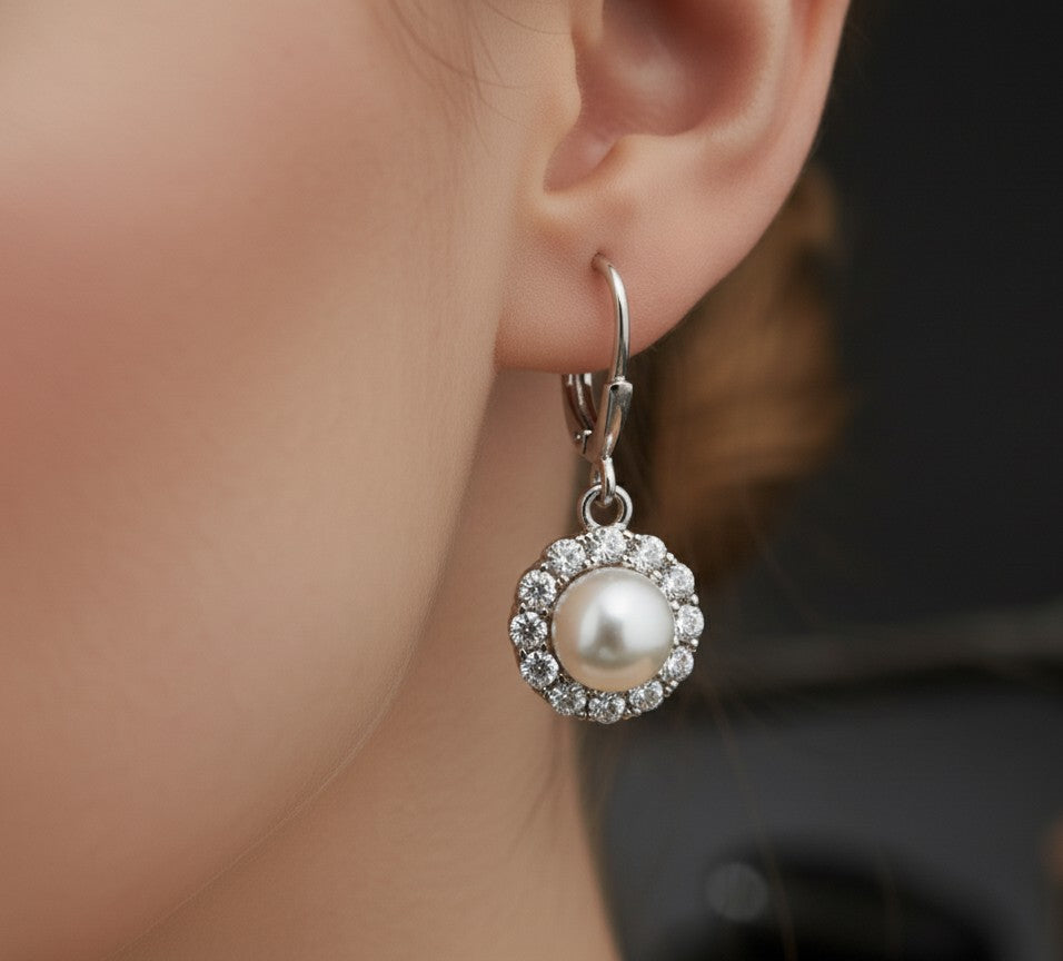 These drop earrings capture true classic elegance with a modern, sparkling twist. At the heart of each piece is a luminous, perfectly round Natural Pearl, radiating its soft, organic luster. This center gem is framed by a breathtaking halo of brilliant Moissanite accents, giving them a sophisticated, floral silhouette. Suspended from secure lever-backs, these earrings offer gentle movement and timeless grace that never goes out of style.