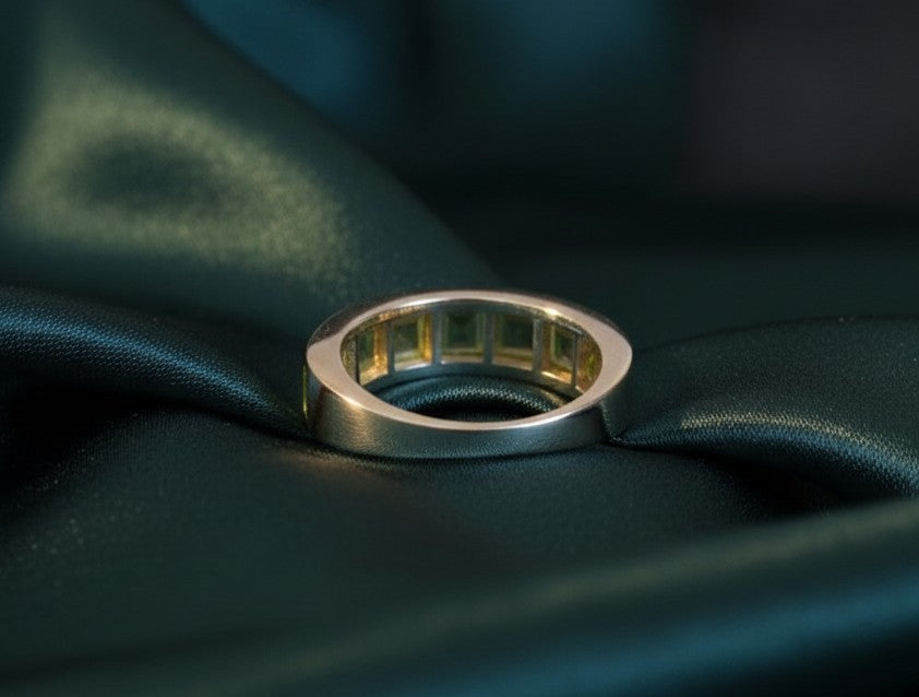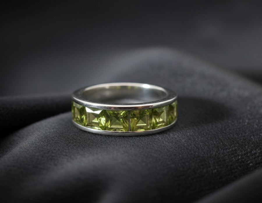Adorn your hand with the vibrant energy of nature in this stunning Eternity Band. This ring features a continuous row of square-cut Natural Peridot gemstones, showcasing that unmistakable, lively lime-green hue. Each stone is safely nestled in a modern channel setting, ensuring maximum brilliance and comfort for daily wear. It’s the perfect modern wedding band or a cheerful statement piece for anyone who loves the fresh, sunny color of this beautiful August birthstone.